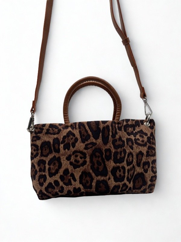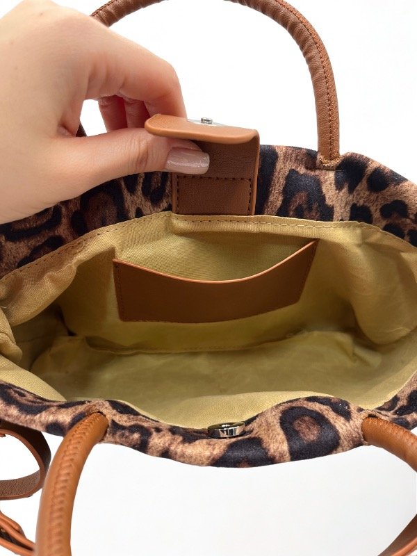 🪡 Confeccionada en tela de tramado leopardo y detalles en cuero ecológico a tono, combina texturas y elegancia en su justa medida. Su interior está forrado y cuenta con un práctico bolsillo para organizar lo esencial.